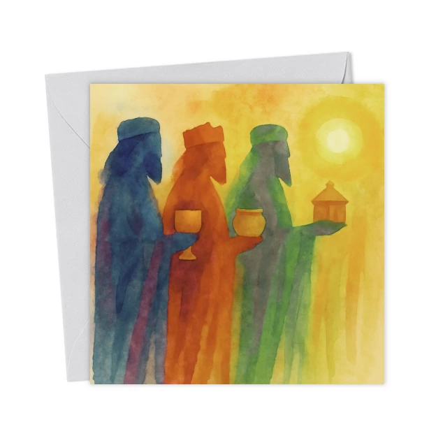 “We Three Kings” is a vibrant Christmas card featuring a colorful image of the Three Wise Men. Its perfect for sharing festive joy, celebrating the Nativity, and sending warm holiday wishes.