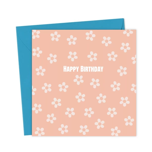 Soft white flowers on a soft peach background. Text reads: happy birthday.
