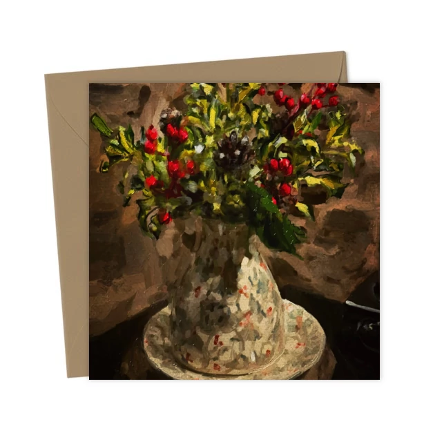 An oil painting of my Crail Pottery vase filled with winter garden foliage, berries, and cones. Hopefully it will cheer your friends and family as it cheers me.