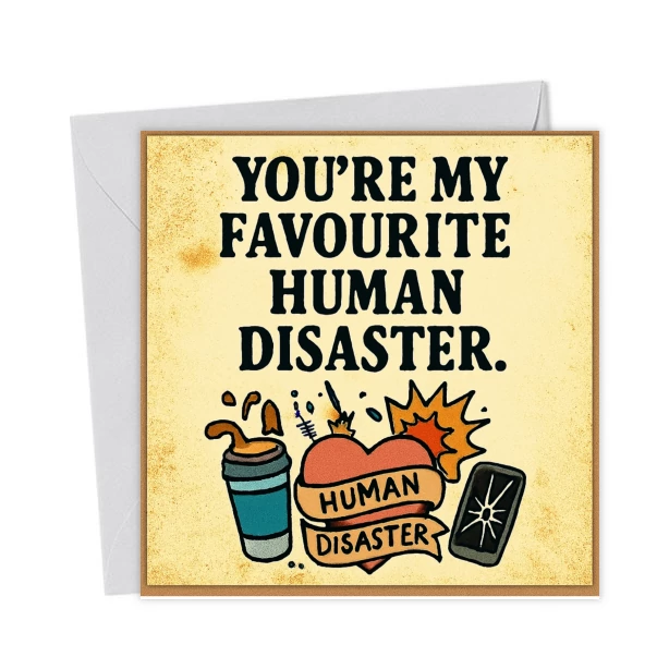 You’re My Favourite Human Disaster – Funny Friendship Card. Celebrate chaos with this hilarious friendship card. Perfect for besties, hot messes, and lovable disasters. Bold, cheeky, and unforgettable