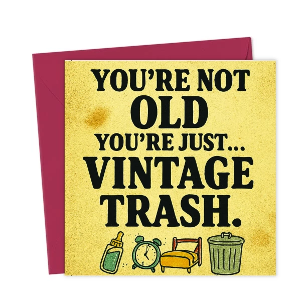 You’re Not Old, You’re Just… Vintage Trash – Funny Birthday Card. Bold retro design with a trash can twist. Perfect for cheeky milestone birthdays, ageing friends, and vintage-style humour.